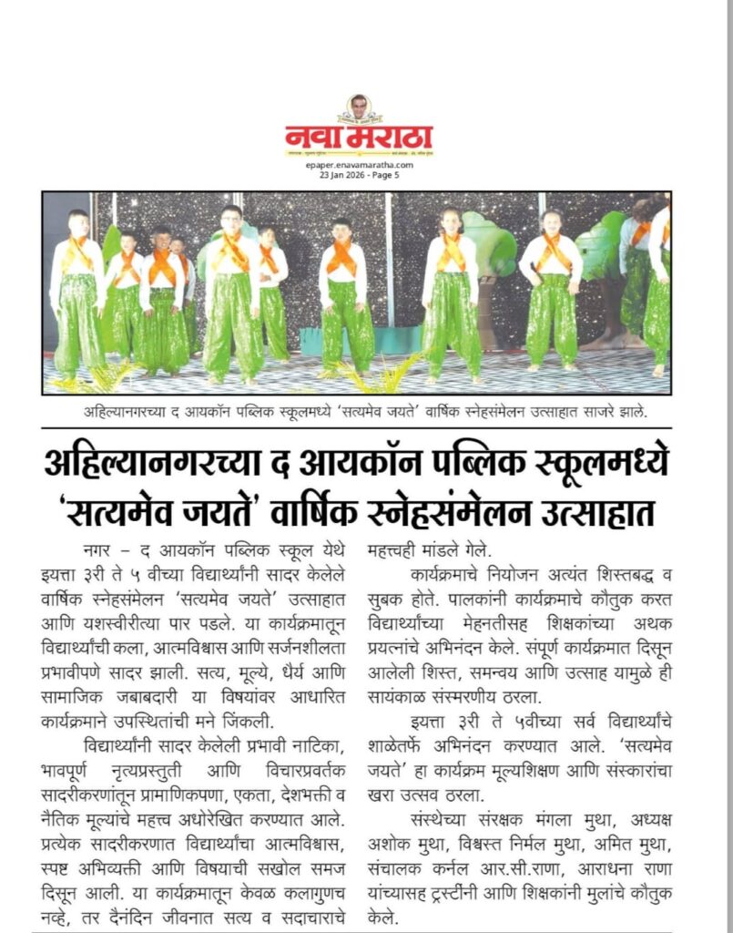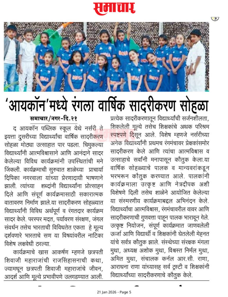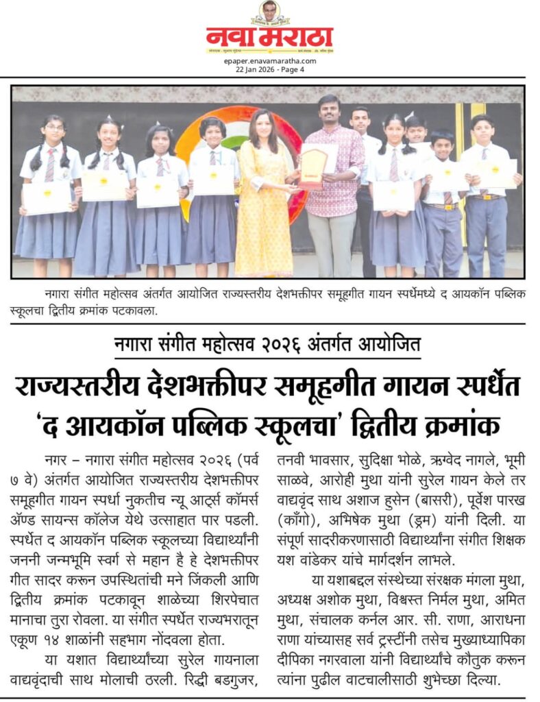 Annual showcase Satyamev Jayate State level singing competition Selected for state-level basketball competition A Hat-trick of Pride, A symphony of patriotism! Colours of Courage Icons Shine in Sports Icon's Basketball Victory Selected for state-level basketball competition A Hat-trick of Pride, A symphony of patriotism! STEM Seminar International Yoga Day Experiential Learning at Icon Experiential Learning Programme Experiential Learning Grade 10 Board Results Grade 10 Topper– Ayush Bodhke Honoring Excellence & Leadership Investiture Ceremony 2025-26 Celebrated Granparents Day 2025 Knowledge Fair 2025 Winners at the Dance Competition 2025 Winners at the Singing Competition 2025 Awarded by Vidya Kiran 2024 Celebrated Sports Day 2024 First Rank in JEE Exam Winners at the Young Scientist Competition 2024-25 Ideal School Award 2024-25 Graduation Day of Fledgllngs 2024 CBSE Teacers Training 2024 Public Speaking Competition International Yoga Day 2024 An International Exchange Summer Camp(1) 2024 Summer Camp(2) 2024 Participation in Summer Competition Ignite Meraki Competition Vasota Fort Trek Camp 2023-24 School Investiture Ceremony (2023-24) Awarded to the National level Echoes of the Ages Award at Elocution Competition Independence Day Celebration